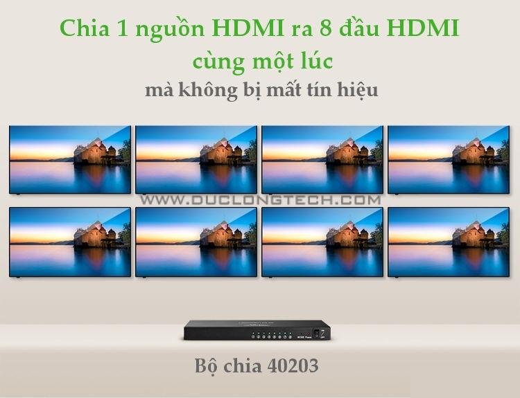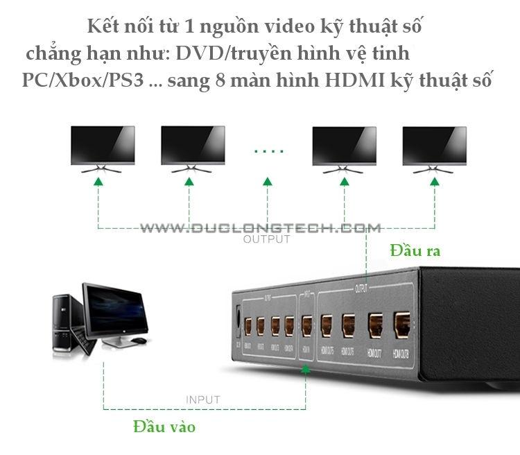 - Tính năng: kết nối truyền tải tín hiểu HDMI từ 1 thiết bị phát ra 8 màn hình cùng lúc